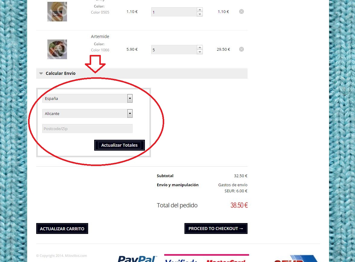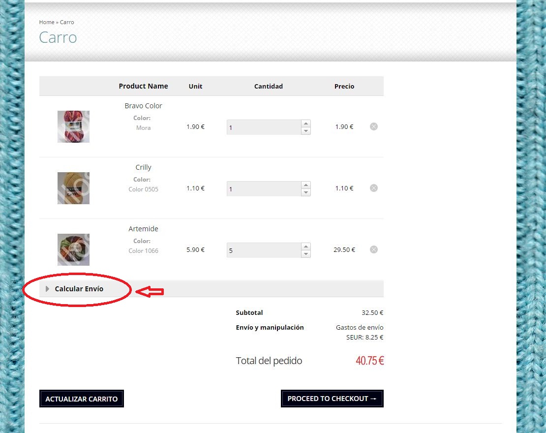 para conocer y cargar los gastos de envío. Pulsaremos, pues, en el texto Calcular envío: